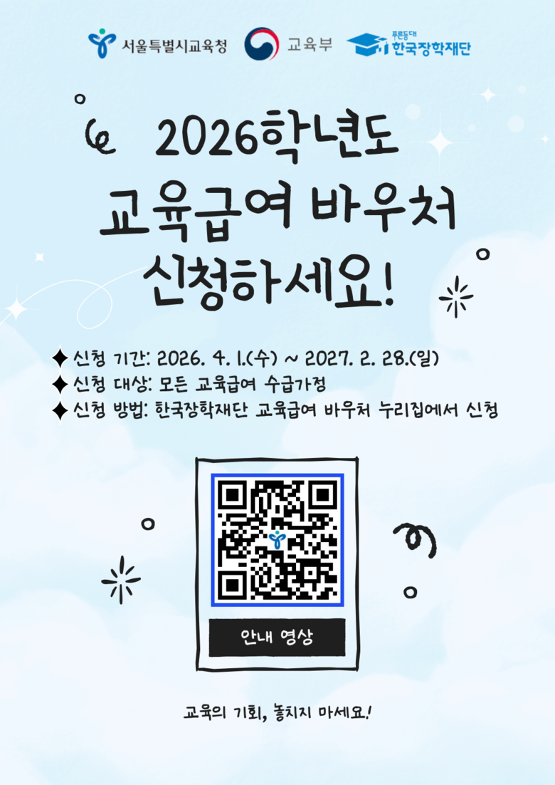 이에 서울시교육청은‘바우처 신청’단계를 누락하여 교육급여를 받지 못하는 사례를 방지하고자, 필수 정보만 직관적으로 담은 숏폼 형식의 ‘2026학년도 교육급여 바우처 신청 안내 영상’을 공식 유튜브 채널(링크: https://youtu.be/sBDn-AOz7eg)에 게시했다.