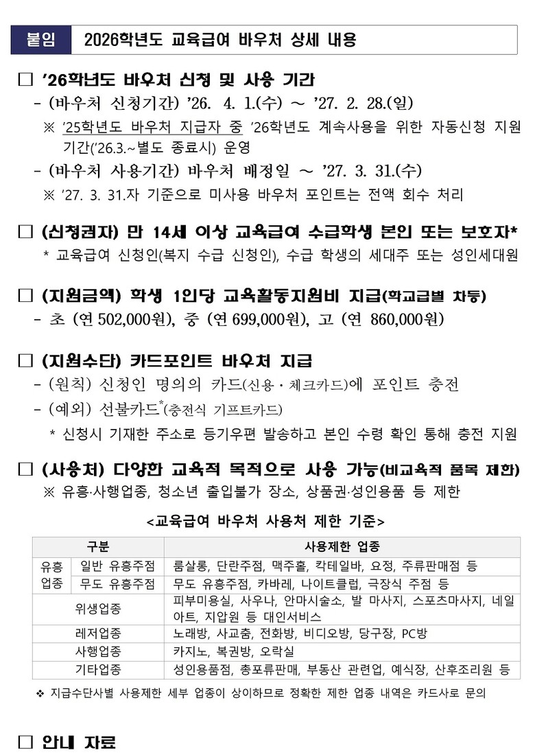교육급여 바우처는 기준 중위소득이 50% 이하인 가구에 지급되는 교육활동지원비로, 올해는 전년 대비 평균 단가가 6% 인상되어 △초등학생 50만 2천원 △중학생 69만9천원 △고등학생 86만원을 지원한다.