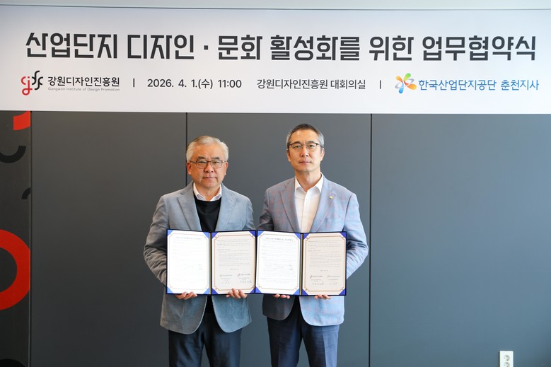 [강원도 세계타임즈=김민석 기자] 강원디자인진흥원(원장 진재한)은 1일 강원디자인진흥원 대회의실에서 한국산업단지공단 강원지역본부 춘천지사(본부장 이규헌)와 산업단지 내 디자인·문화 활성화를 위한 공동사업 추진 업무협약을 체결했다고 밝혔다.