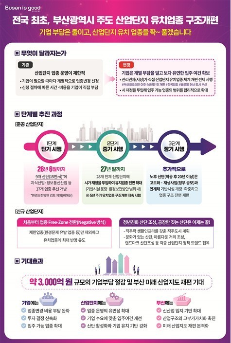시는 산업단지 관리권자인 부산광역시장이 직접 구조 개편을 주도해 부산 전역 기업의 다양한 입지 수요에 유연하게 대응하고, 신산업이 역동적으로 성장할 수 있는 기반을 마련할 계획이다.