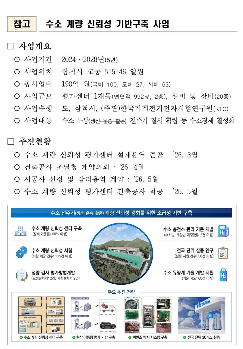 ‘수소 계량 신뢰성 평가센터’는 산업통상부 공모사업에 선정되어 ’24년부터 ’28년까지 삼척시 교동 일원에 총사업비 190억 원이 투입되는 사업으로 부지 1,500㎡에 건축물 1개동(연면적 992㎡)과 20종의 시험장비 등을 구축하여 수소 계량장비 인증・검사를 수행한다.